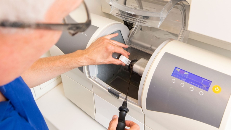 Bei der modernen CEREC® -Technologie scannt eine kleine Kamera alle notwendigen Daten Ihrer Zähne und Ihres Kiefers. Damit fällt der klassische Abdruck weg. Diese Kamera macht bis zu 50.000 Bilder und bis zu drei Millionen 3D-Punkte pro Sekunde und liefert damit höchste Präzision . In einem dazugehörigen Computerprogramm wird dieser digitale Abdruck geladen. Auf dieser Basis können wir am Bildschirm ihren Zahnersatz z. B. eine Krone passgenau und individuell für sie konstruieren. Der Computer ist direkt an eine Präzisionsfräsmaschine angeschlossen, welche ihren Zahnersatz vollautomatisch aus Keramik anfertigt. Nach Anprobe und Oberflächenveredlung kann dieser innerhalb einer Sitzung eingesetzt werden.